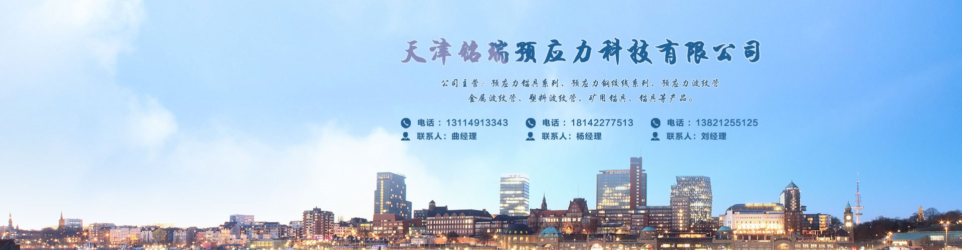 天津铭瑞预应力科技有限公司是专业研发销售:预应力锚具和预应力钢绞线系列及预应力波纹管、金属波纹管、塑料波纹管、预应力锚具、矿用锚具、锚具、地下室囊式预应力抗浮锚杆、囊式扩大头抗浮锚杆、囊体抗浮锚杆 扩大头抗浮锚杆、精轧螺纹钢抗浮锚杆等系列产品。公司坐落于天津市子牙经济开发区高新产业园高速辅路10号,注册资金1000万元,是华北地区预应力钢绞线及锚固体系的专业经营公司。 本公司积累了丰富的科研和工程实践经验,在不断完善产品质量的同时,致力于预应力技术的研究与开发。本公司愿与国内外科研,设计,施工单位,携手合作,共同探索预应力技术的新领域。